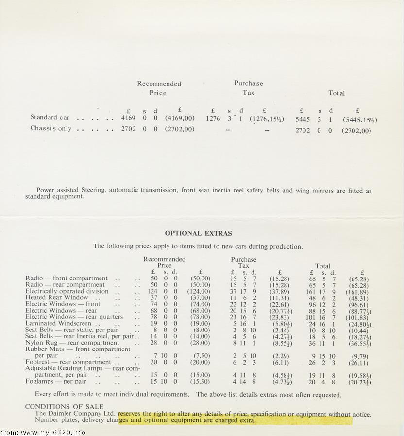 1970 was by far the best year in the DS420 history. 428 limousines were sold, where no other year even came above 300, and most years even stayed below 150. When a new price list was issued, Jaguar usually had three different editions: Jaguar "price list of all models", Daimler "price list of saloon models", and Daimler "price list of limousine model". They all had the same date of publication. I have seen a price list for Jaguar Models dated January 1970, which means that a Limousine Model price list for this same date probably is missing in my collection. This February price list has no publication number.