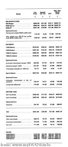 Also in October 1979, a full range price list was printed for the 52nd Scottish Motor Show (publication No. 3413/D). It covered Austin (incl. taxi and hire car), Morris, Rover, Triumph, MG, Jaguar and Daimler. The format of this price list is a harmonica of 6 pages on each side.