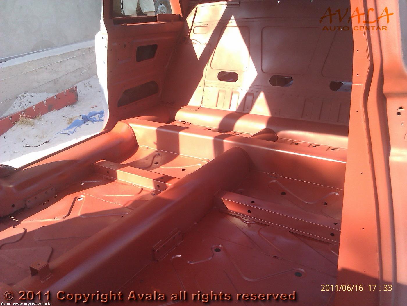 Looking into the body shell after blasting. Floor and back wall visible. The DS420 was built on an enlarged MK10/420G floorpan. The welding seams of the enlargement panel are well visible.