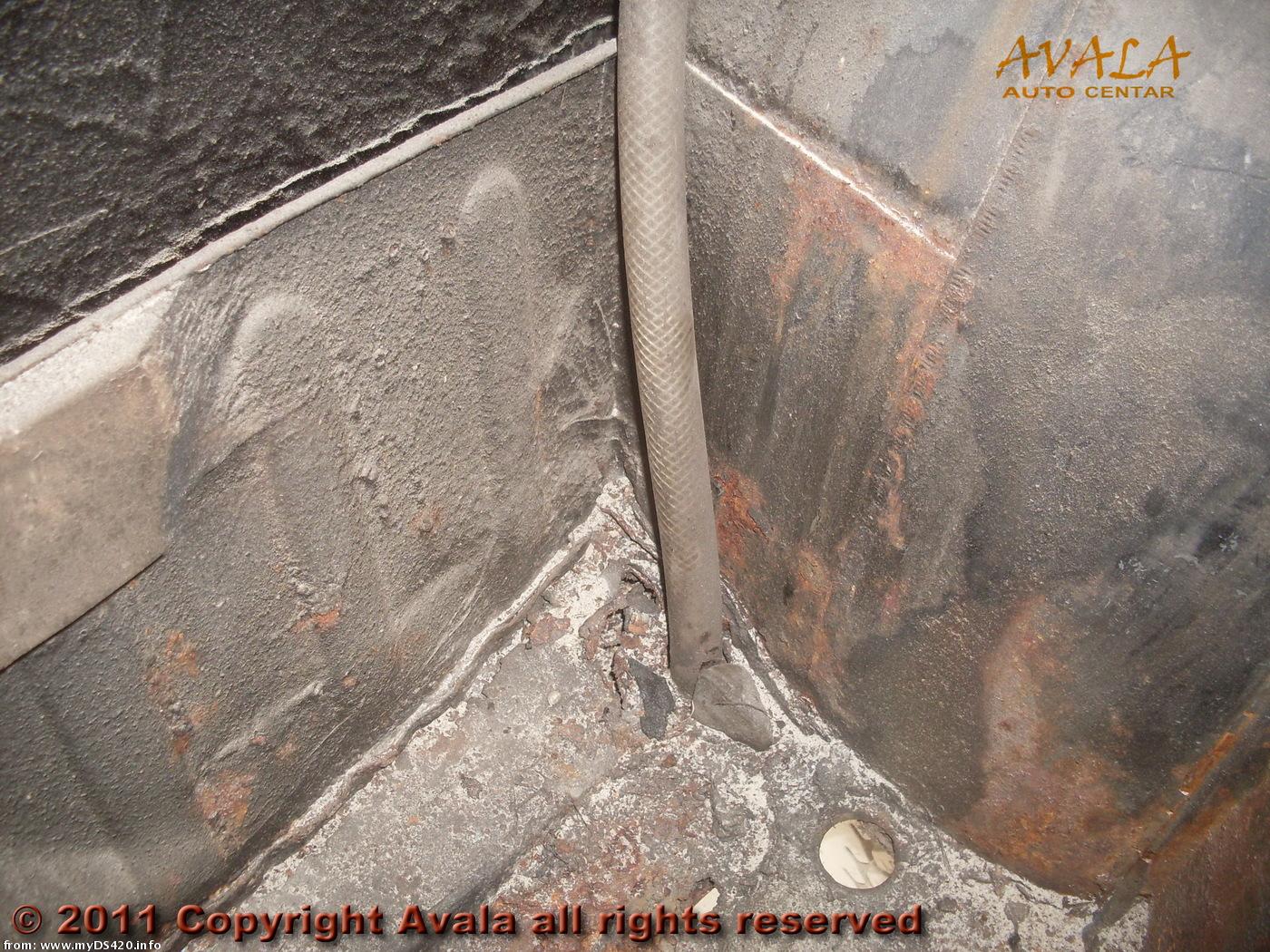 Front left corner of the holding space for the left fuel tank. The hose is the water drain from the filler well. It ends under the car. Note how these hoses deteriorate at the end. This brings water on the floor under the tank, which is always very rusty. The hole without hose is for the drain from the collector bin in between the hinges of the boot lid (for water coming down from the rear window).