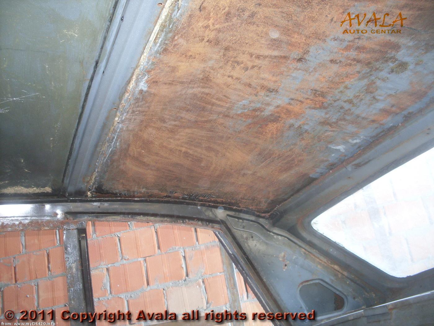 Rear right corner of the passenger compartment, with corner of the ceiling and right C- and D-posts of the body. The ceiling at the right shows that the upholstery was glued against the metal. The ceiling to the left has its upholstery glued on a wooden foundation plate which is then attached to the ceiling by screws and clips. The reinforcment beam in the ceiling (to the left of the centre of the upper half of the picture, starting from the C-post) is where most landaulette conversions stop. Taking that beam away requires compensating reinforcements via the sides and the floor of the body. But leaving it in place means that passengers cannot stand upright through the open roof, since that beam is just above the front edge of the passenger bench.