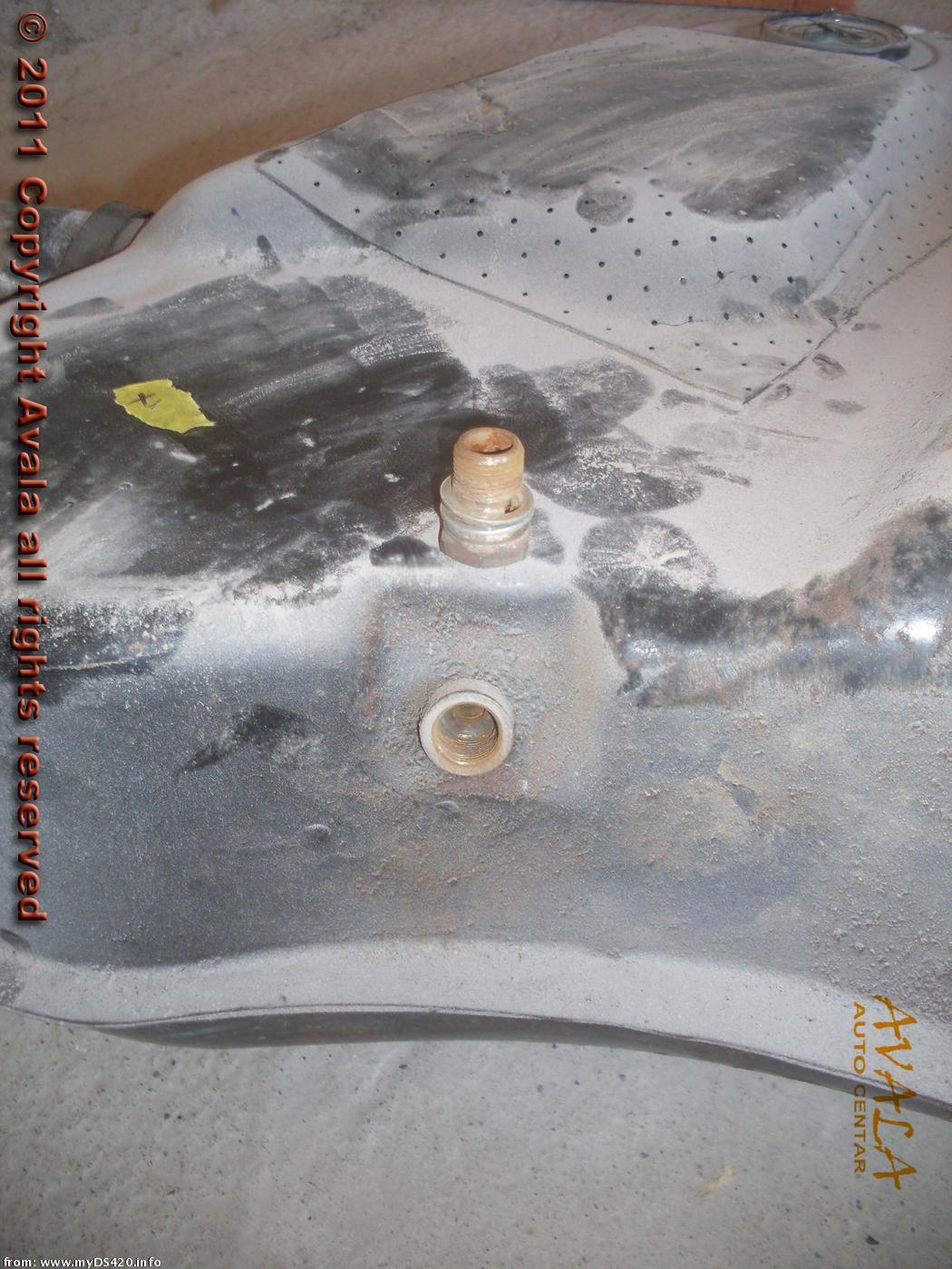 Front of fuel tank, with the opening for the suction hose to the fuel pump. The bolt is removed. The end of the hose has a so-called "banjo bolt" which is kept in place by the bolt shown here. This "banjo bolt" is over the hole in the bolt shown here.