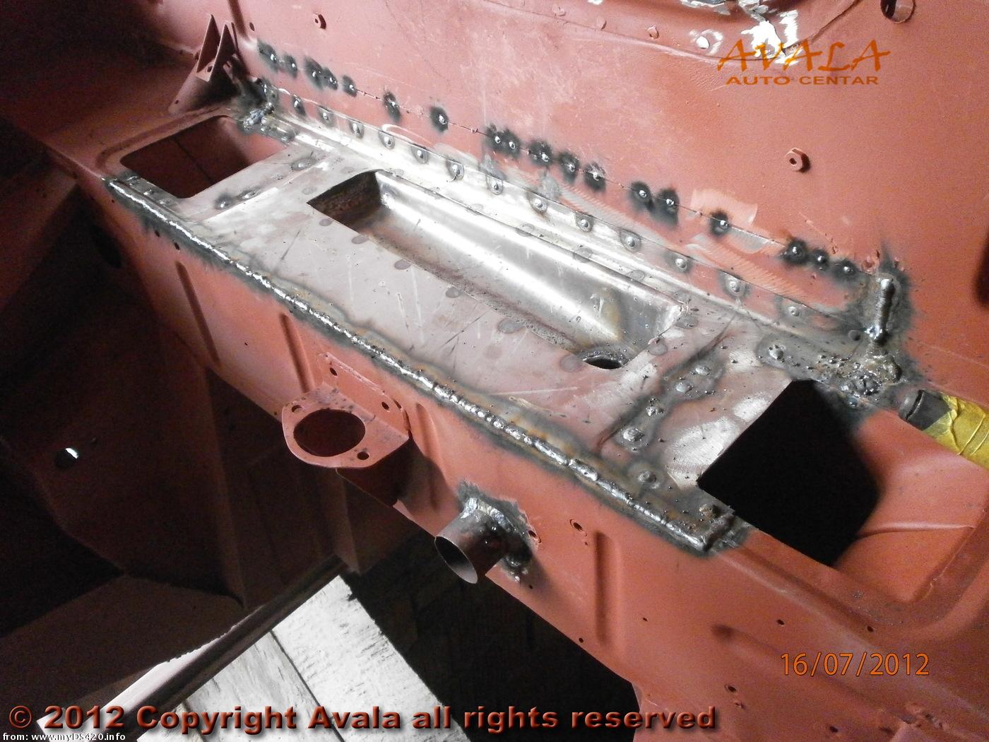 Repair panel welded in place against the fire wall in the engine bay. The heater unit will be placed on top of this. The drain hole inside the bin and the open pipe extending just below it are connected.