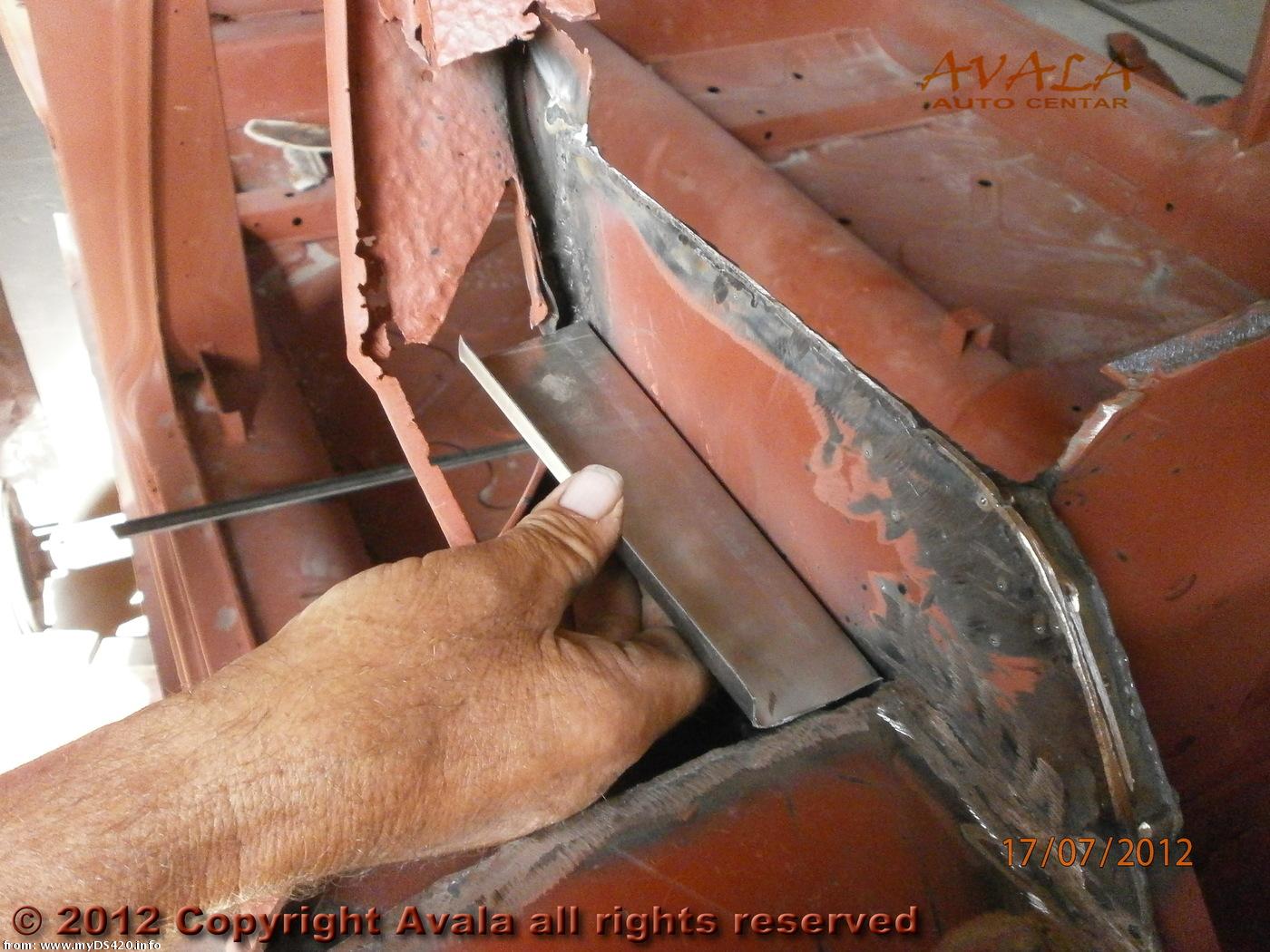 Repair panel fitted near the lower right corner of the windscreen. The A-post extends upward. The transmission tunnel in the floor is clearly visible.