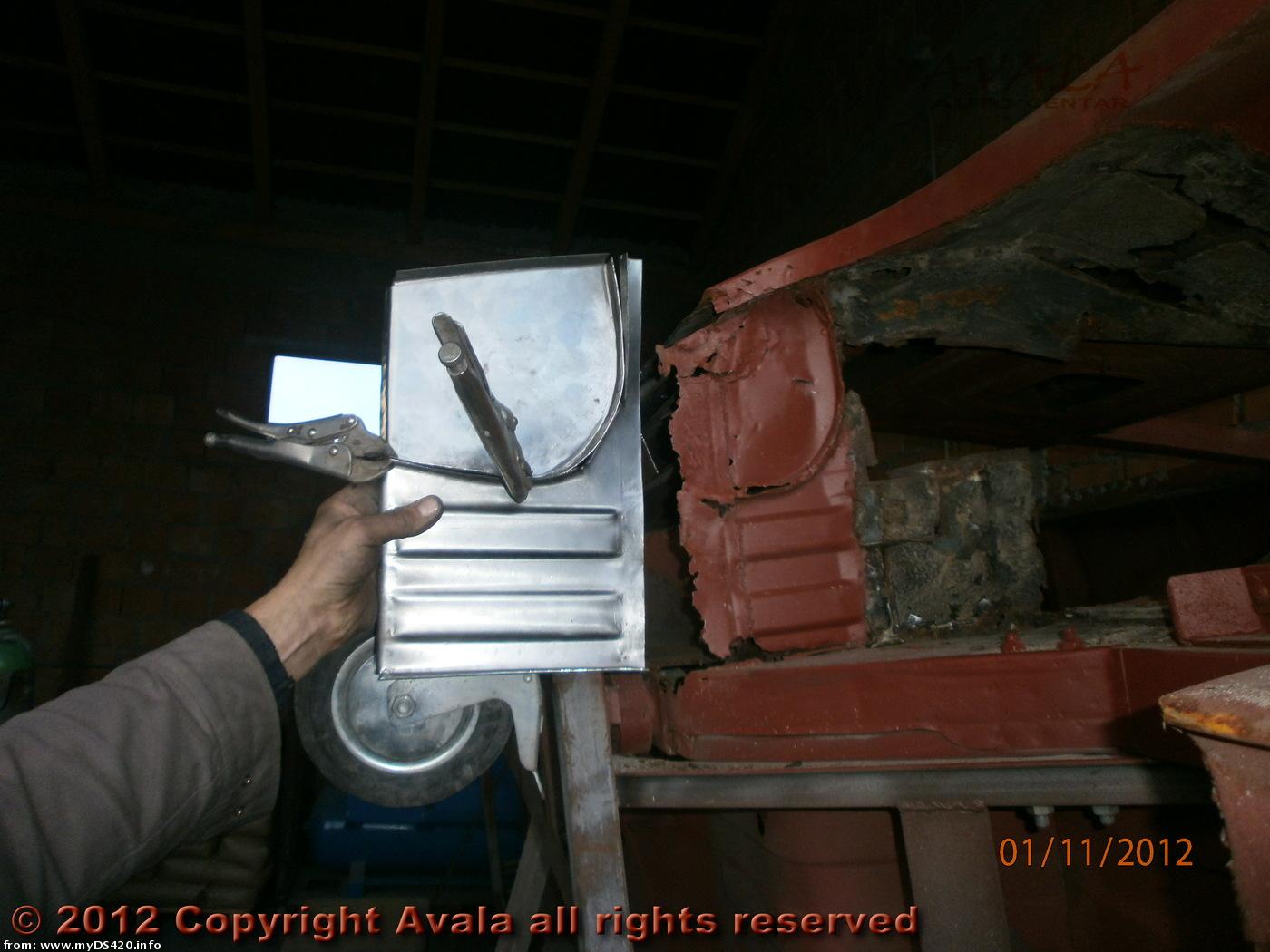 Car tilted. Looking into the left rear wheel well, to the front of the car, Replacement panel is for the front side of the wheel well, covering the "head" of the sill.