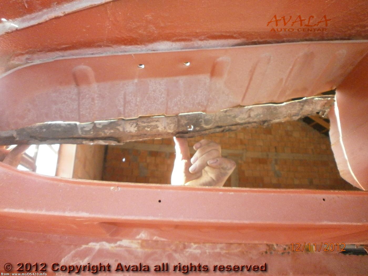 Car is tilted. Looking through the space where the bottom under the left fuel tank was removed. Replacement panel at the bottom of the rear side wing being fitted.