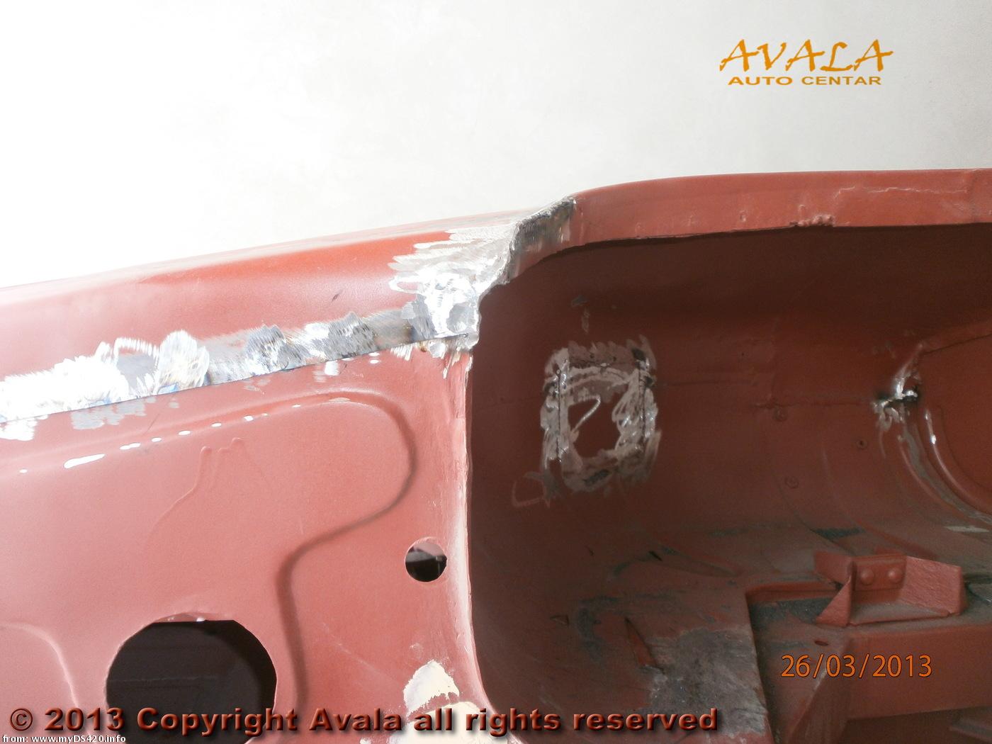 Car is tilted. View from below to the rear end of the right rear wheel well, and the floor under the right fuel tank.