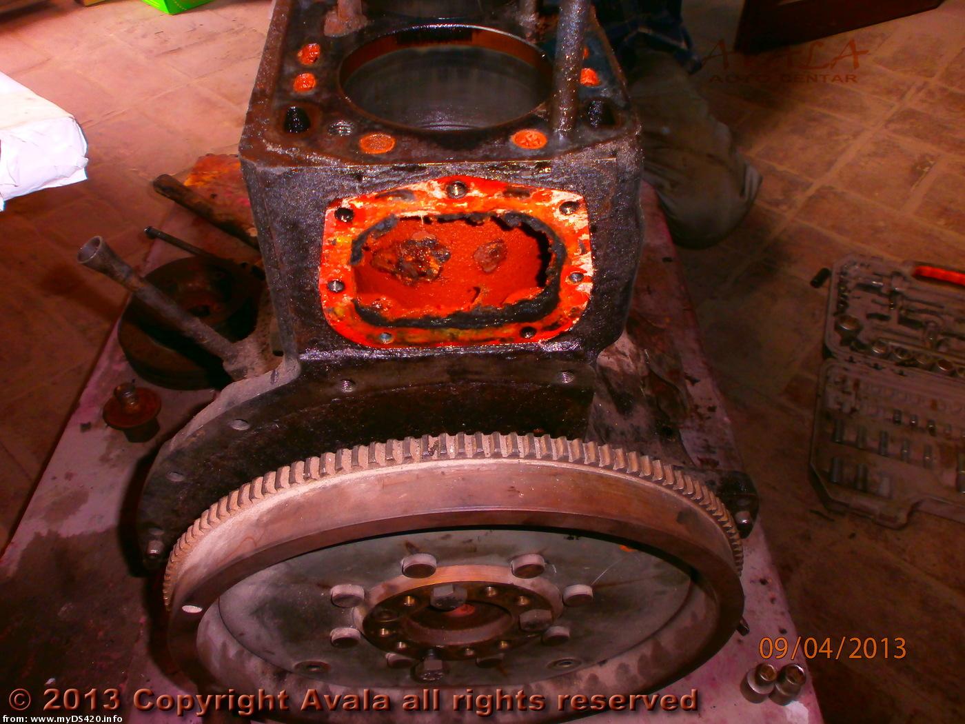 Close up view to the rear of the engine block above the flywheel. Engine head removed.