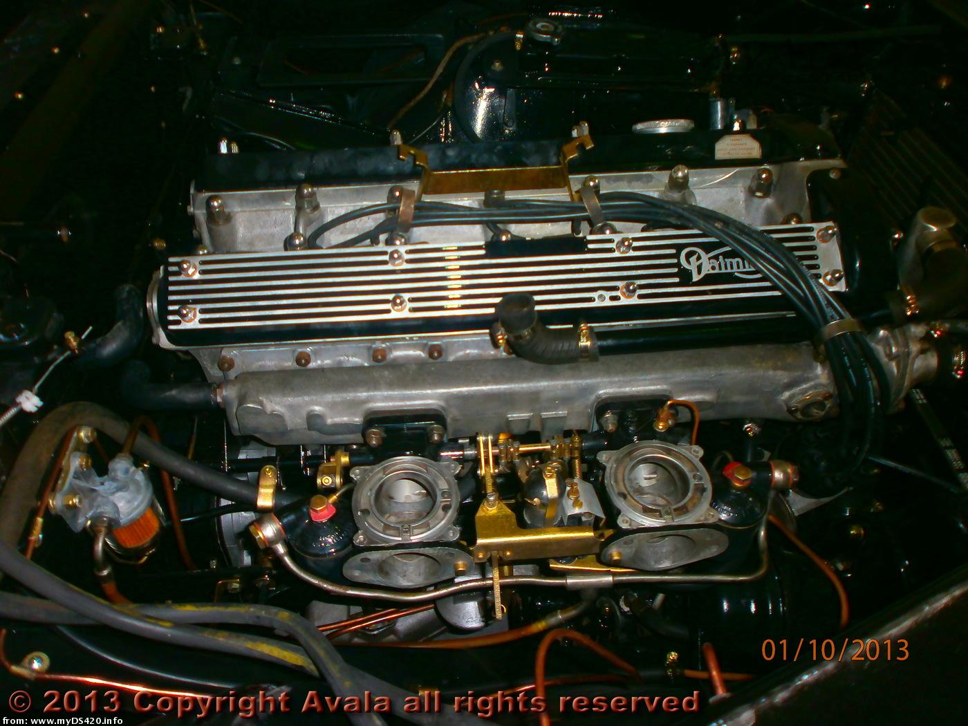 Close up of engine in engine bay, seen from right side. Carburettors not yet complete. Air filter not yet installed.